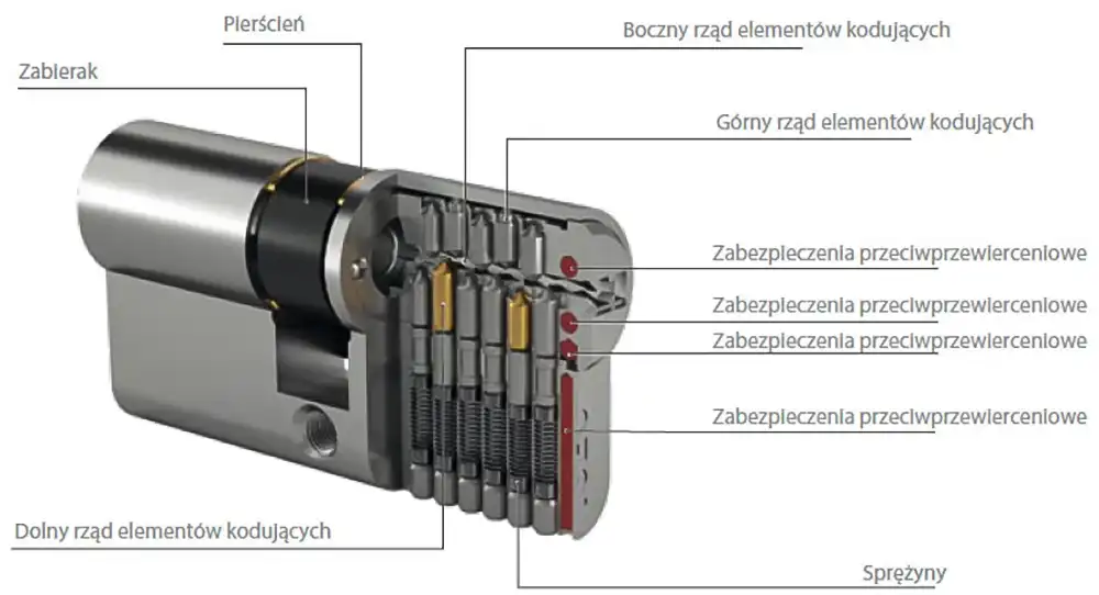 - Zabezpieczenie przed rozwierceniem: w korpusie i bębenku.